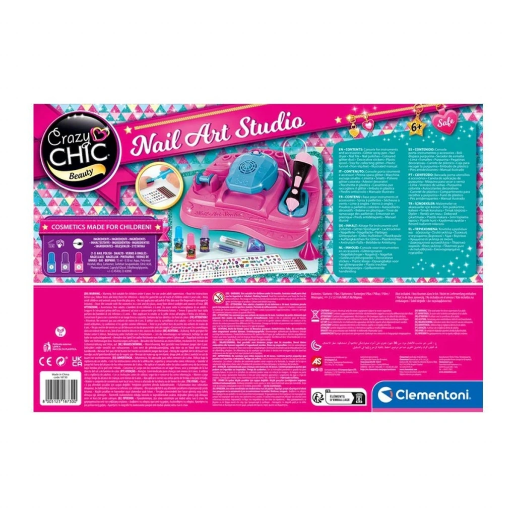 Sim püskürtücü ve oje kurutma makinesi kesinlikle son modaya uygun bir görünüm garanti ediyor. Set, harika parıltılı süslemeler için Crazy Chic ojeler, tırnak için çıkartmalar ve renkli simler içerir!